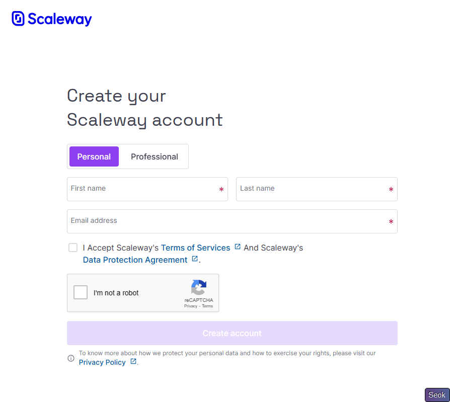点击Sign Up进行注册,填入名称以及邮箱即可,默认Scaleway是使用Magic Link(邮件验证)进行登录的,也可以设置密码登录,可开启二次认证;须注意的是Scaleway使用了reCAPTCHA服务,请自助使用服务来验证二维码;
