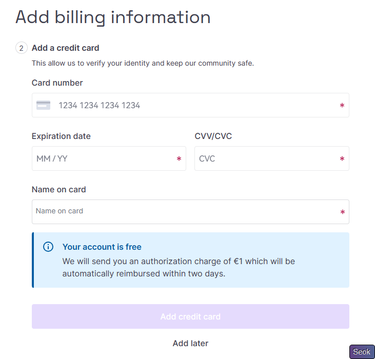 去邮箱找到Scaleway发来的邮件进行验证,填写账单地址时由于使用的是银联卡(默认Stripe),最好还是填的靠谱点;之后就是填写银行卡信息,由于是银联借记卡,没有CVC号和过期日期,所以随意填写下面的过期日期和CVC即可,填写完毕后会跳转到Stripe进行验证