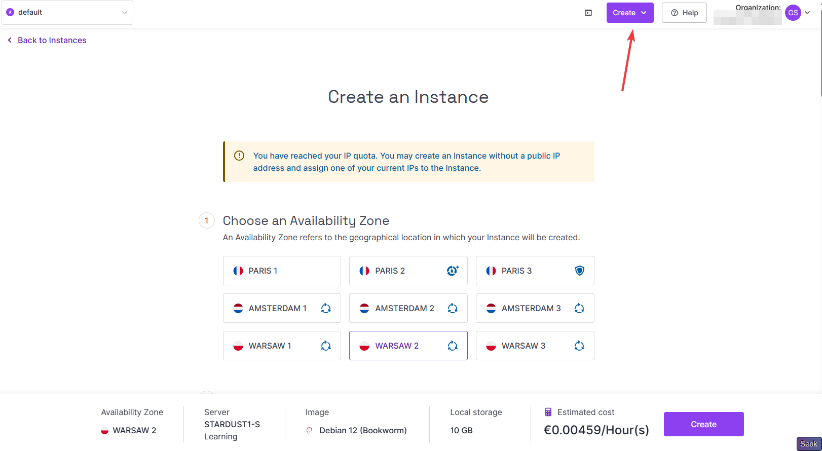 添加之后,跳转到组织首页,点击右上角的Create创建机器(Instance)