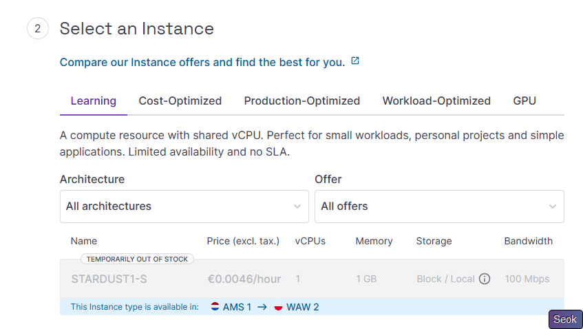 默认巴黎一区是开不出StarDust的(似乎可用使用cli开,这里不做介绍),可选阿姆斯特丹一区和华沙2区开StarDust;StarDust默认配置为1C1G10G硬盘,限速100Mbps,不过使用起来这100Mbps大概只是“长时间下的限速”,日常是可用突破100Mbps的。