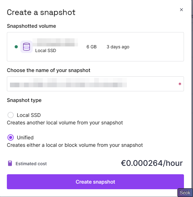 成功后删除10G的Local硬盘,同时给你刚刚创建的Block Volume创建Snapshot(快照),选择Unified类型